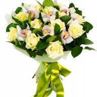 Орхидеи, которые являются основными в этой цветочной композиции, - это символы элегантности и совершенства, а их изысканный белый цвет делает букет еще более нежным и трепетным. Розы нежно-желтого оттенка помогут выразить ваше признание и восхищение, а использование при создании композиции листьев салала насыщенного зеленого цвета делают букет более ярким и выразительным. С помощью этой непревзойденной и невероятно нежной композиции вы непременно сможете подарить получателю море позитивных эмоций.
